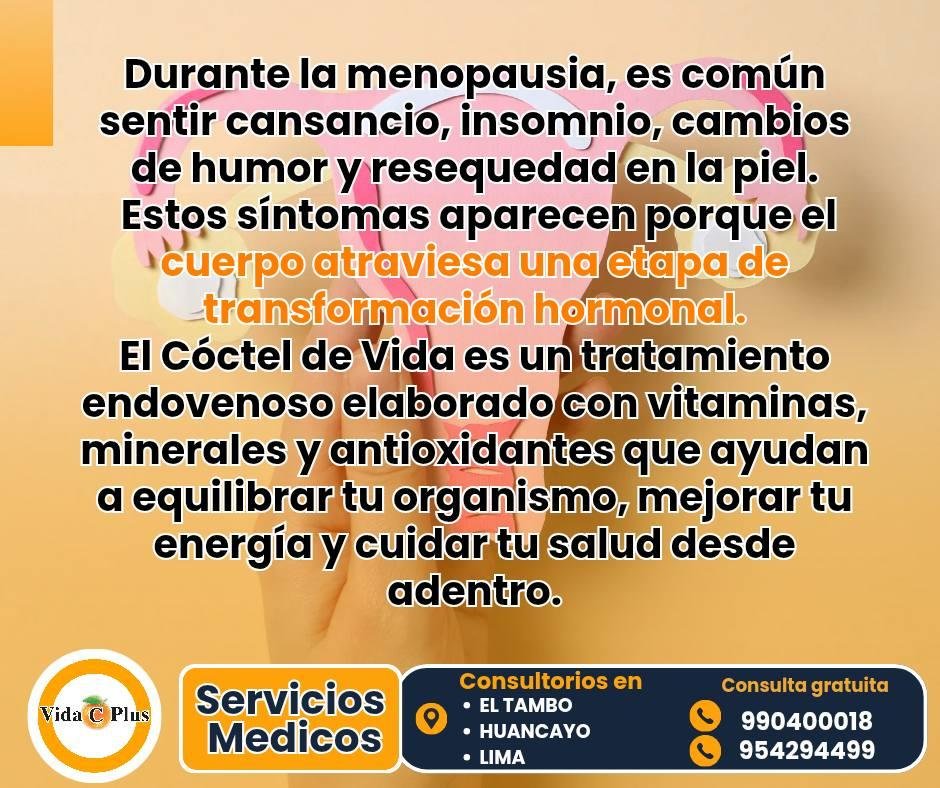 Somos Vida C Plus, tu centro de medicina especializada en Huancayo. Contamos con más de 10 años de experiencia en terapias endovenosas de alta calidad. Nuestras especialidades: Vitamina C Endovenosa (Cóctel de Vida): Fortalece tu sistema inmune con esta fórmula vitamínica más potente y segura. Ideal para elevar tu energía, reducir el estres mejorar tus articulaciones y antienvejecimiento. Ácido Zoledrónico: Expertos en la aplicación de este tratamiento para la fijación de calcio y el fortalecimiento óseo (osteoporosis). Es la terapia más reconocida por nuestros pacientes. ¡Confía en los especialistas en aplicacion de Zoledrónico y Vitamina C Endovenosa en Huancayo!